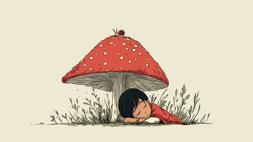 WonderMuralDette charmerende fototapet har en skøn illustration af et sovende barn i skyggen af en rød svamp, hvilket bringer en aura af magi og ro til dit in...