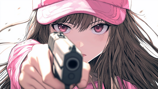 Se fulde detaljerFototapet manga | Pige med våben og pink kasket
