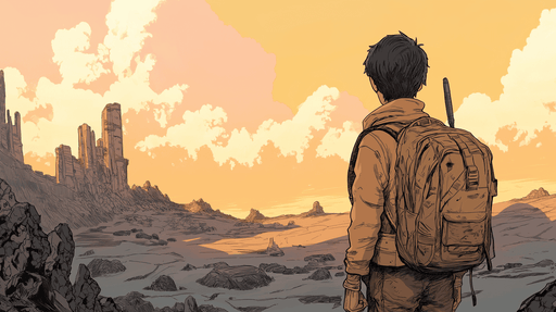 WonderMuralDette fængslende fototapet har et ørkenlandskab, hvor en ung eventyrer står foran majestætiske ruiner, badet i det bløde lys fra en solnedgang. De ...