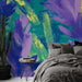 De dominerende farver inkluderer nuancer af limegrøn, mørklilla og lysegul, som kan suppleres med neutrale tilbehør eller strejf af let træ for at balancere den visuelle intensitet af tapetmuralen.