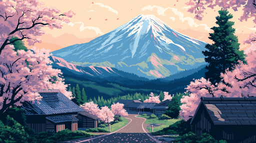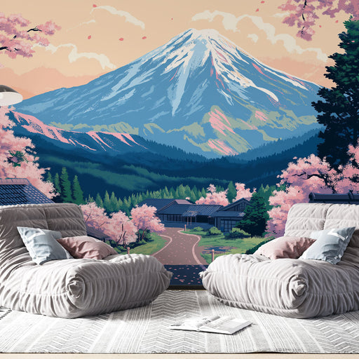 WonderMuralVores tapet vækker roen i et japansk landskab, der fremhæver et majestætisk sneklædt bjerg omgivet af kirsebærblomster. Nuancerne af pink og grøn b...