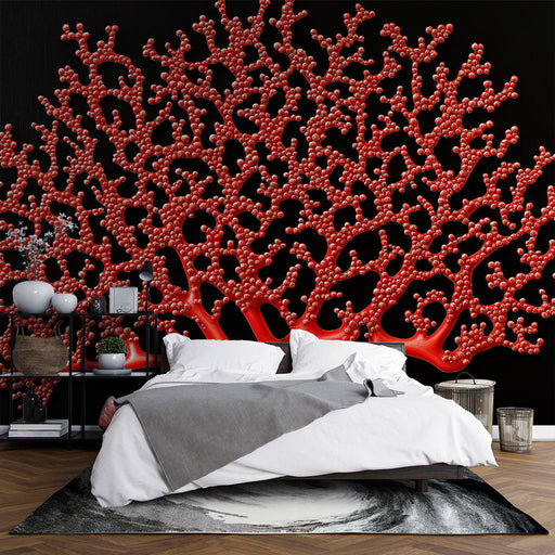 WonderMuralOplev vores tapet med et forbløffende rødt koral mønster i relief, der skiller sig ud mod en elegant sort baggrund. Dette mural kunstværk vækker mi...