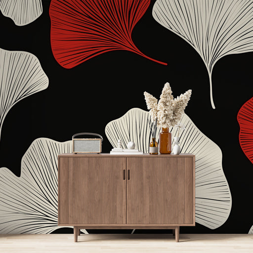 WonderMuralDette tapet har et moderne design, der kombinerer enkelhed og elegance med stiliserede blade i nuancer af rød og creme, der skiller sig ud mod en d...