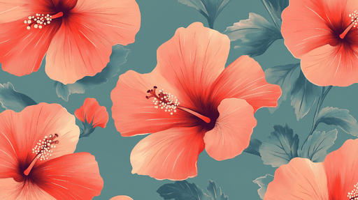 WonderMuralTropisk hibiscus Denne tapetmaleri Tropisk hibiscus fanger med sine store hibiscusblomster, der er delikat tegnet på en teal baggrund. De koralfarv...