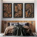 Opdag vores elegante fototapet med tropiske bladmønstre i silhuet, der kombinerer udskårne former med en varm baggrund. Lædernuancerne i jordfarver fremhæves subtilt af dyb sort, hvilket skaber en moderne og sofistikeret atmosfære.