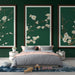Denne fototapet har et delikat mønster af stiliserede kirsebærblomster, der viser bølgende grene prydet med cremehvide blomster. Den dybe grønne baggrund bringer et strejf af sofistikation og skaber en harmonisk og beroligende atmosfære i ethvert rum.