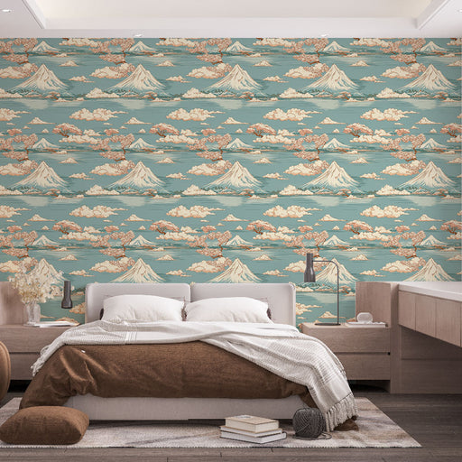WonderMuralDenne tapet har et charmerende motiv af majestætiske bjerge omgivet af fluffy skyer, prydet med delikate kirsebærblomster. De beroligende nuancer a...