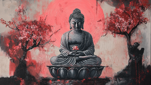 WonderMuralDette fængslende tapetmaleri viser en storslået afbildning af Buddha, der sidder omgivet af kirsebærblomster. Kontrasten mellem den dybe sorte af B...