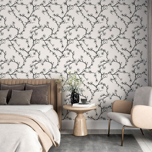 WonderMuralDette fototapet har et delikat motiv af kirsebærtrægrene, smukt illustreret i sort og hvid. Kirsebærblomsterne og knopperne blomstrer mod en lys ba...