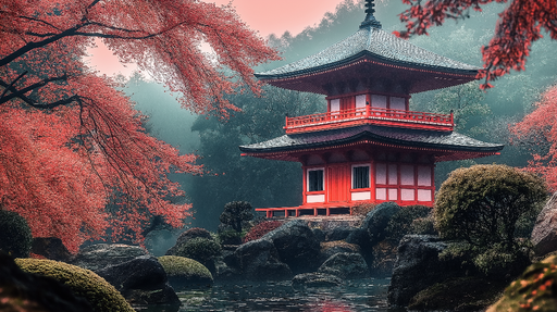 Se fulde detaljerTapet zen have | Rød pagode og kirsebærblomster