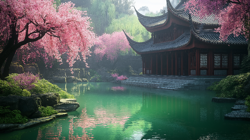 WonderMuralDette tapet inviterer til ro med sit smukke kirsebærblomst mønster i delikate lyserøde toner, plantet nær en rolig dam. Den traditionelle pavillon ...