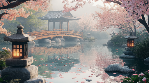Se fulde detaljerTapet zen have | Fredelig scene med kirsebærblomster og træbro