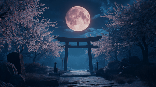 WonderMuralDette fængslende fototapet illustrerer et beroligende natlandskab, hvor kirsebærblomster indrammer en majestætisk torii under det bløde lys fra en ...