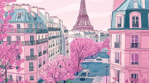 WonderMuralDette tapet vækker magien i Paris om foråret og viser en gade foret med kirsebærblomster i delikate nuancer af lyserød. I baggrunden står den ikoni...