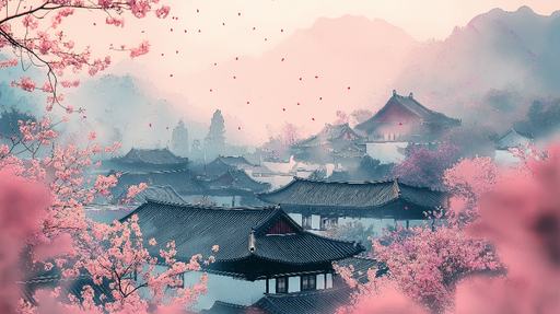 WonderMuralDette fototapet afslører et fortryllende panorama af traditionelle asiatiske byer omgivet af storslåede kirsebærblomster. De bløde nuancer af pink ...