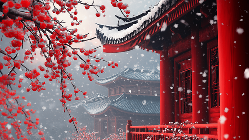 WonderMuralDette fototapet fremhæver et storslået asiatisk landskab, der viser røde kirsebærblomster pyntet med sne og en traditionel bygning med delikat arki...