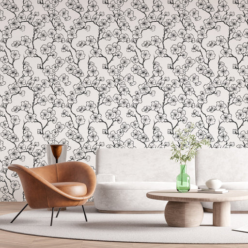 WonderMuralVores tapet har et elegant mønster af kirsebærtrægrene prydet med delikate blomster, alt i sort og hvid for en stærk og tidløs visuel effekt. Det k...