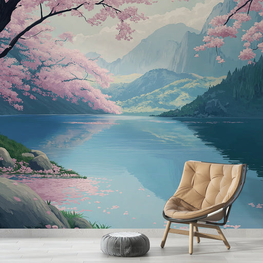 WonderMuralVores fototapet illustrerer en smuk scene af kirsebærblomster ved en fredelig sø og tilbyder en rolig og beroligende stemning. De delikate lyserøde...
