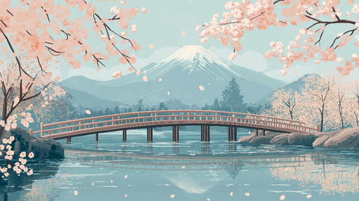 Se fulde detaljerFototapet kirsebærblomster | Traditionel bro og fredelig bjerg under en beroligende himmel