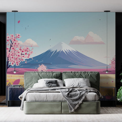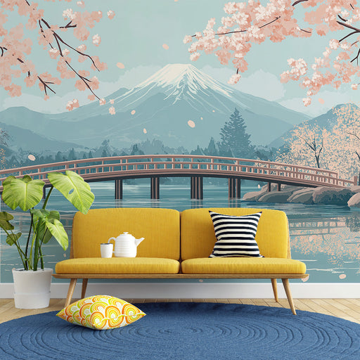 WonderMuralOplev vores smukke fototapet, der repræsenterer et fredeligt japansk landskab med det majestætiske Mount Fuji i baggrunden, indrammet af delikate k...