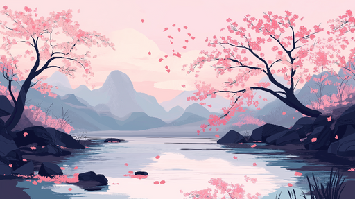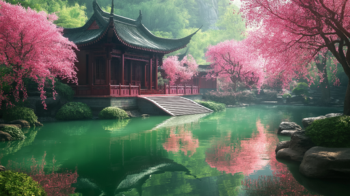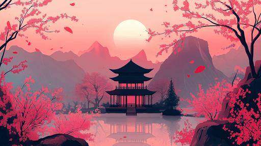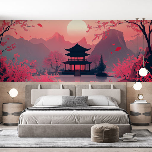WonderMuralOplev vores smukke tapet, der illustrerer et fredeligt landskab med kirsebærblomster i forgrunden og en elegant traditionel bygning ved en søbred. ...