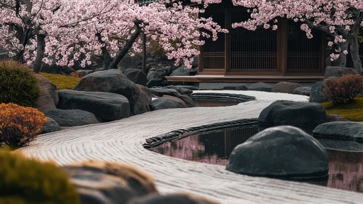 Se fulde detaljerTapet Japansk Have | Roen i en japansk have med kirsebærblomster