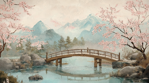 WonderMuralOplev vores fototapet, der repræsenterer et smukt asiatisk landskab, hvor en træbro majestætisk står over stille vand, omgivet af delikate kirsebær...