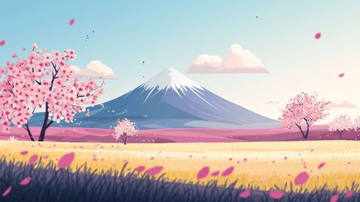 Se fulde detaljerFototapet Mont Fuji | Stiliseret illustration af Mount Fuji omgivet af kirsebærblomster