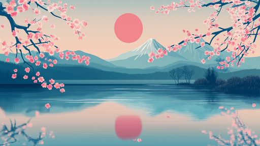 WonderMuralVores Fototapet har en fortryllende scene inspireret af japansk skønhed, hvor den strålende solnedgang reflekteres i det rolige vand i en fredelig ...