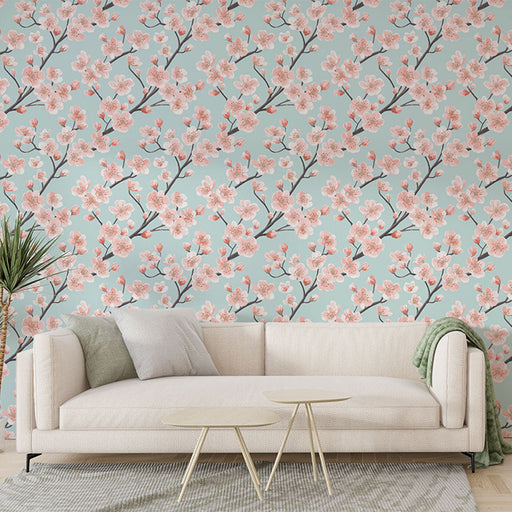 WonderMuralVores tapet har et smukt kirsebærblomst mønster, med grene prydet med delikate lyserøde blomster, der harmonisk kontrasterer med en pastelblå baggr...