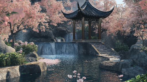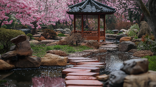 Se fulde detaljerTapet zen-have | En fredelig have med kirsebærblomster og en traditionel pavillon