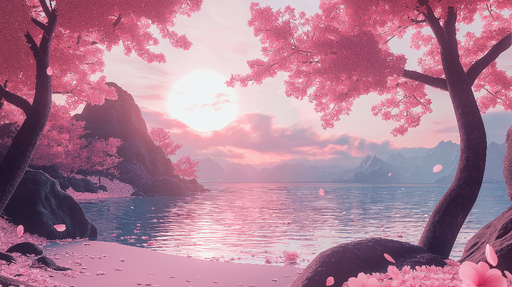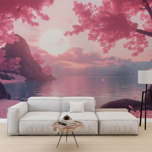 WonderMuralOplev vores eksklusive fototapet, der repræsenterer et serent landskab, hvor magien af blomstrende kirsebærtræer blandes med blødheden af en solned...