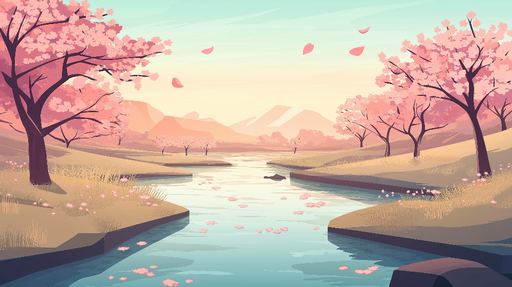 WonderMuralVores Fototapet illustrerer et smukt forårslandskab, med en fredelig strøm, der snor sig gennem en fortryllende baggrund af kirsebærblomster. De bl...