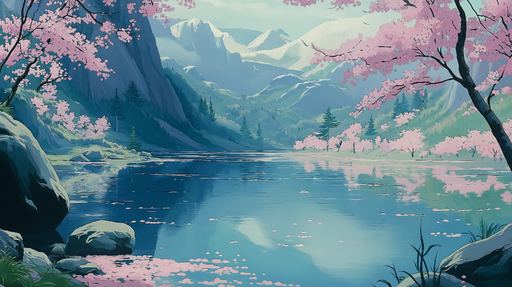 WonderMuralVores fototapet har et beroligende forårslandskab, der viser en rolig strøm omgivet af delikate lyserøde kirsebærblomster. De majestætiske bjerge i...