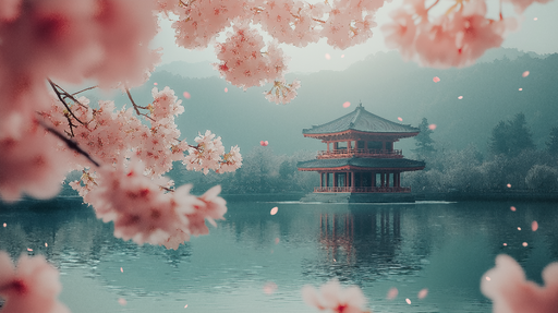 WonderMuralDette fototapet fanger den rolige skønhed af en asiatisk pavillon, der flyder på en stille sø, indhyllet i en magisk ramme af kirsebærblomster. De ...