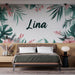 Dette storslåede fototapet fremviser et levende tropisk design, med sarte lyserøde blomster og frodige grønne blade, der skaber en varm og indbydende atmosfære. Navnet Lina er smukt integreret i midten, hvilket giver en personlig touch til dekorationen.