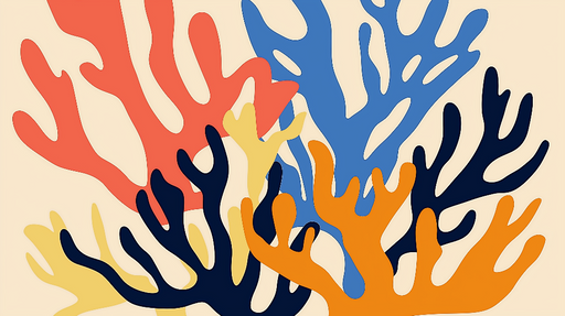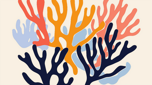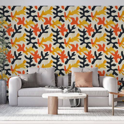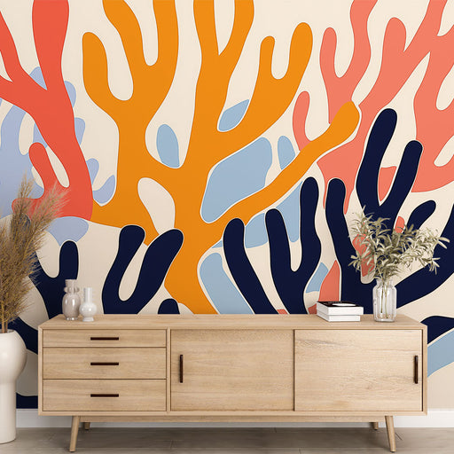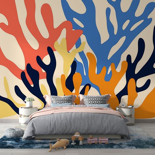 WonderMuralDette omhyggeligt designede tapet har et fascinerende mønster af stiliserede koraller, formet i livlige nuancer af orange, rød, blå og gul på en bl...