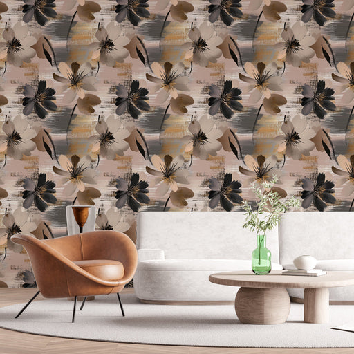 WonderMuralDenne tapet har et smukt mønster af abstrakte blomster på en tekstureret baggrund, der kombinerer bløde farver såsom lyserød, beige og grå, akkompa...