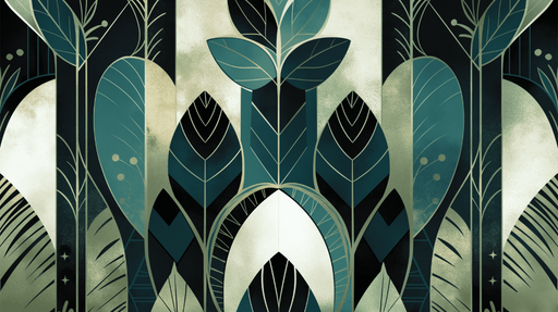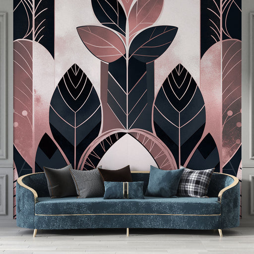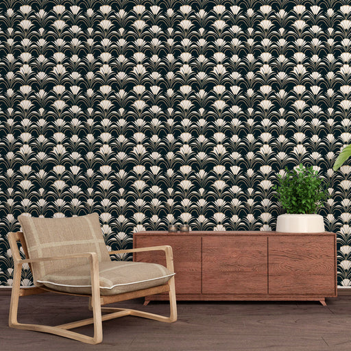 WonderMuralOplev vores Fototapet med art deco påvirkninger, der har et elegant motiv af stiliserede blade, der udfolder sig på en dyb sort baggrund. Nuancerne...