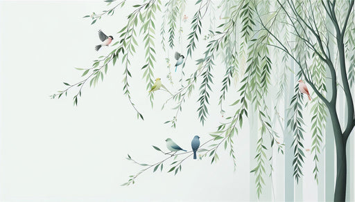 WonderMuralDette Tapet med motiv af blade er en hyldest til naturen og roen, med delikate pilegrene og en række farverige fugle, der synes at danse blidt i vi...