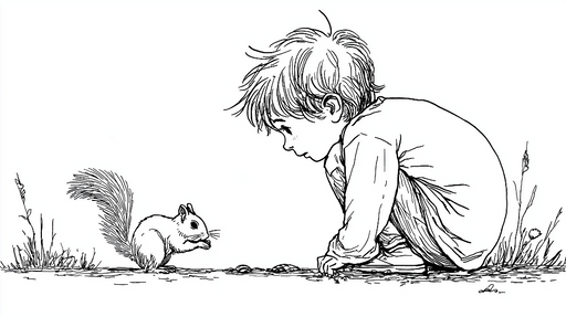 WonderMuralVores fototapet viser en elskelig sort-hvid illustration af et nysgerrigt barn, der kryber for at observere en egern. Dette fængslende billede vækk...