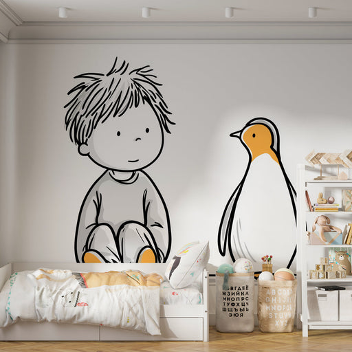 WonderMuralDenne farverige og legende fototapet har en sød illustration af en lille dreng, der sidder ved siden af en pingvin. Simpliciteten i linjerne og de ...