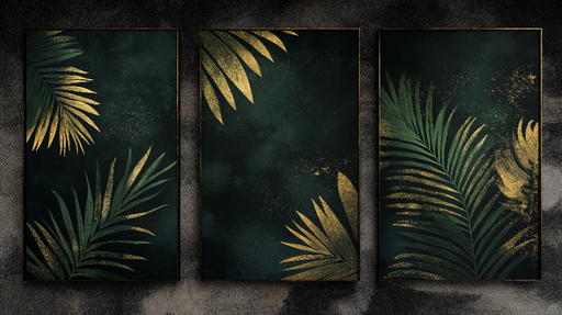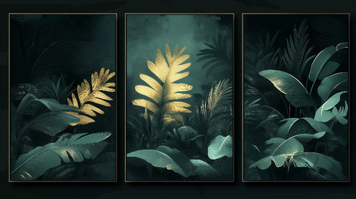 WonderMuralDette tapet fremkalder naturlig ro takket være sin dybe grønne baggrund og delikate gyldne bladillustrationer. Designet kombinerer modernitet og el...