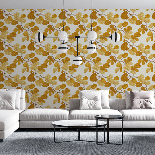WonderMuralDette fototapet har et storslået mønster af gyldne blade på en delikat cremefarvet baggrund, der skaber en varm og indbydende atmosfære. De sorte l...