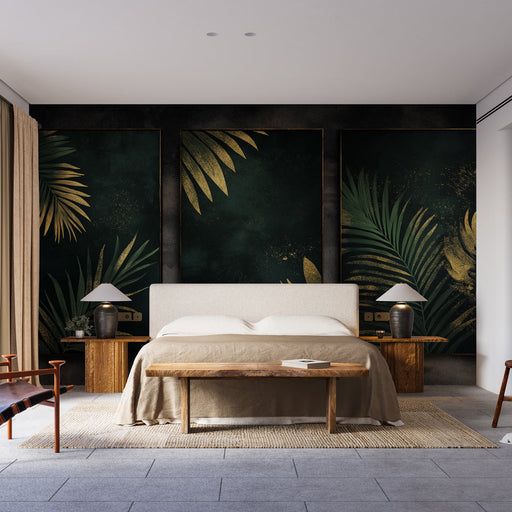 WonderMuralVores tapet tilbyder et fantastisk design af gyldne palmeblade på en dyb grøn baggrund, hvilket skaber en luksuriøs og moderne effekt. De gyldne to...
