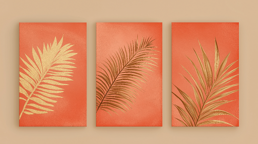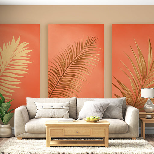 WonderMuralVores tapet har en trio af gyldne palmeblade på en livlig koral baggrund, der skaber en dynamisk og varm kontrast. De delikate mønstre og gyldne fi...