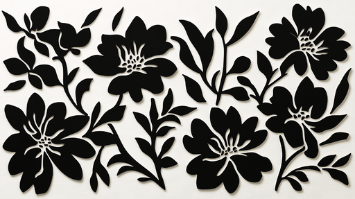 WonderMuralDenne fedte tapetfotografi har store sorte silhuetblomster på en hvid baggrund, hvilket skaber en slående og elegant kontrast. De blomstrende forme...