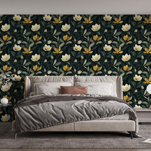 WonderMuralOplev vores tapet, der elegant kombinerer gyldne blomster og grønne blade på en dyb sort baggrund. Dette delikate mønster, lavet af små hvide bloms...