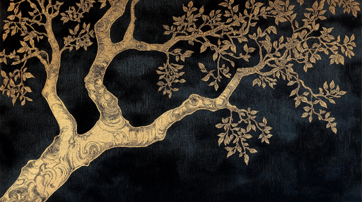 WonderMuralDette tapet med mural har et raffineret design, der viser stiliserede trægrene i guld, smukt kontrasteret af en dyb sort baggrund. De delikate deta...