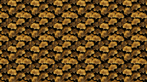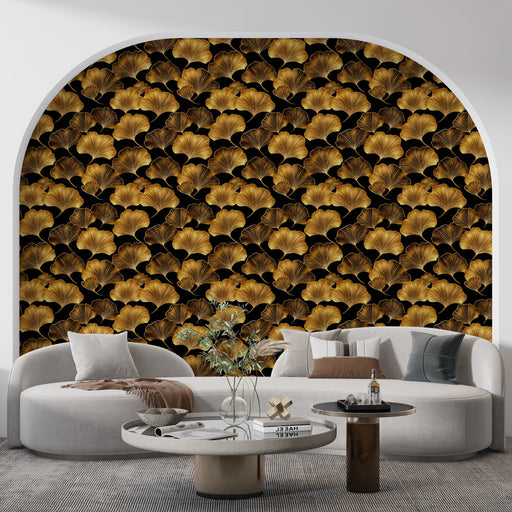 WonderMuralVores fototapet viser et overdådigt mønster af gyldne ginkgo blade på en dyb sort baggrund, der tilbyder en slående kontrast, der fanger øjet. De d...